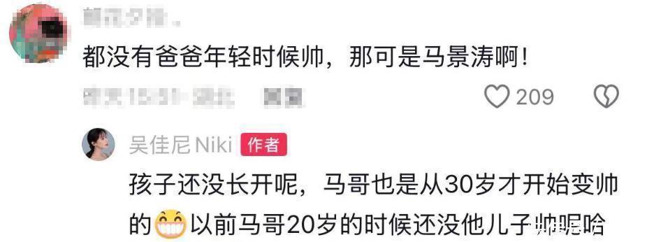 不过,作为星二代嘛,也有网友拿两个孩子和爸爸马景涛的颜值进行比较。有个网友甚至觉得马世天兄弟俩都没有爸爸年轻时候那么帅气。不过,吴佳尼可不这么觉得,她直接说两个儿子还没有完全长开。在她看来,马景涛也是到了30岁才开始变得帅气的,而他20岁那会儿还比不上自己儿子们好看。吴佳尼还挺自豪地说,等两个孩子五官都长齐了,一定比老爸还要帅。